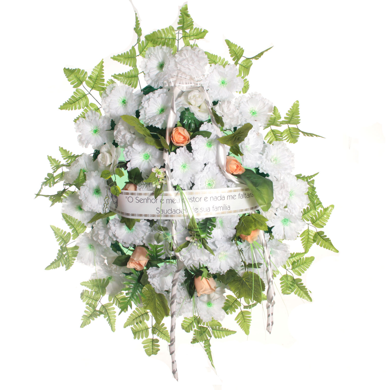 COROA DE FLOR DE SEDA NOBRE: coroa em flor artificial de seda, tamanho médio, formato gota, 0,70 m x 0,55 m, com faixa.