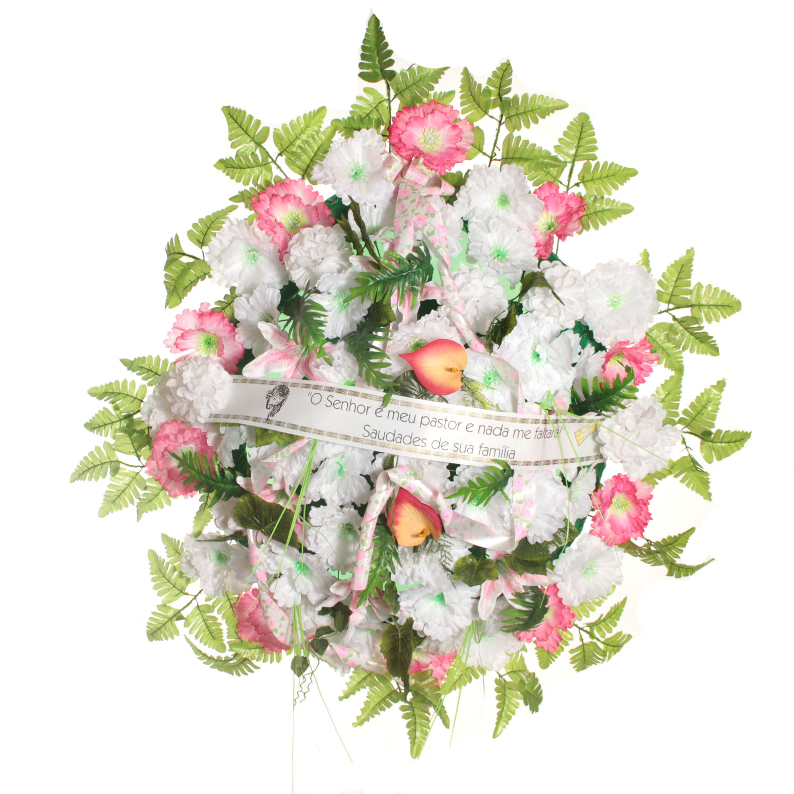 COROA DE FLOR DE SEDA STANDARD: coroa em flor artificial de seda, tamanho grande, formato redondo, 1,00 m de diâmetro, com faixa.